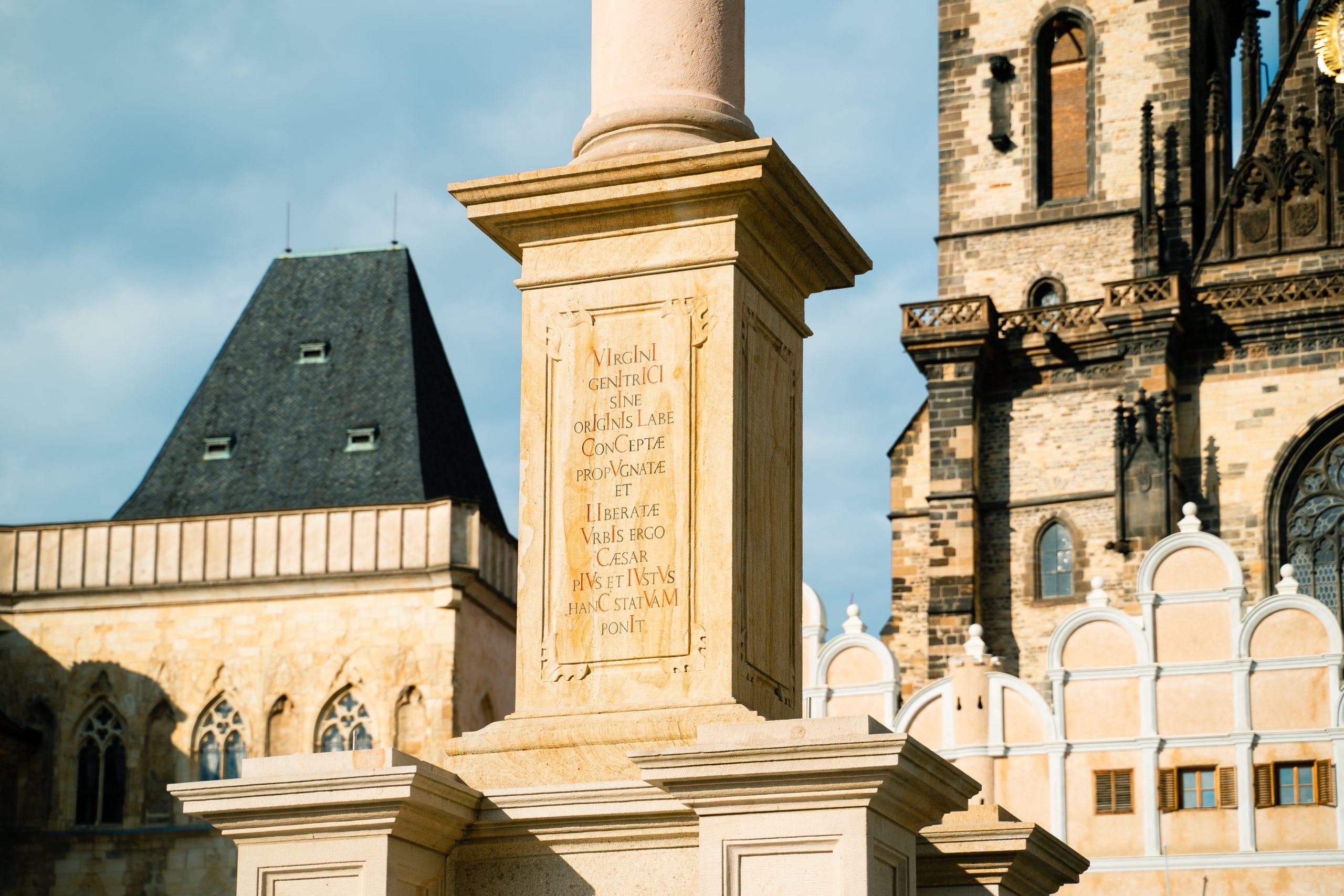 "Panně Rodičce, počaté bez poskvrny prvotního hříchu, za obranu a osvobození města, proto zbožný a spravedlivý císař tuto sochu staví."