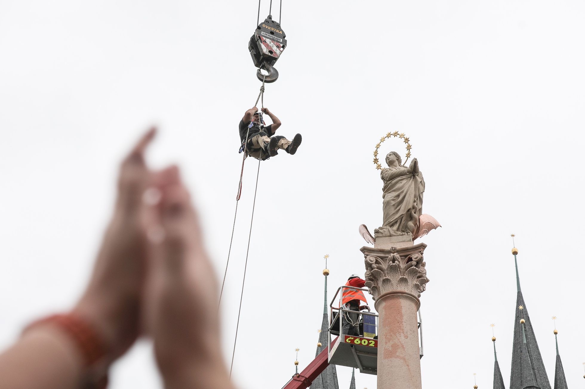 Usazení nové sochy Panny Marie na vrchol obnoveného sloupu na Staroměstském náměstí.