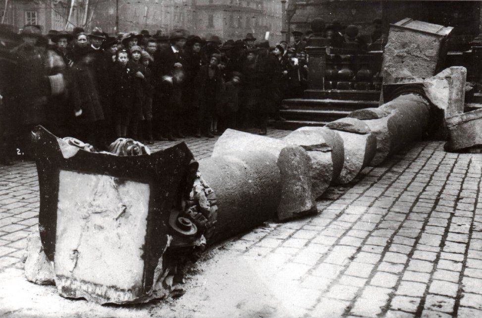 Ve skutečnosti šlo o manipulovanou akci radikálního křídla socialistů, která zneužila výročí bitvy na Bílé hoře a rozdmýchala konfesijní spor ve chvíli, kdy nově vzniklá republika potřebovala spíš smíření než další štěpení. Obyčejní Pražané se pokoušeli stržení zabránit – byli však fyzicky vytlačeni. Úředníci vyslaní z Národního výboru přijeli pozdě. Z původního sloupu zůstaly trosky, které byly převezeny do kláštera sv. Anny – do náruče Panny Marie, jako by se zraněná dcera vrátila ke své matce.